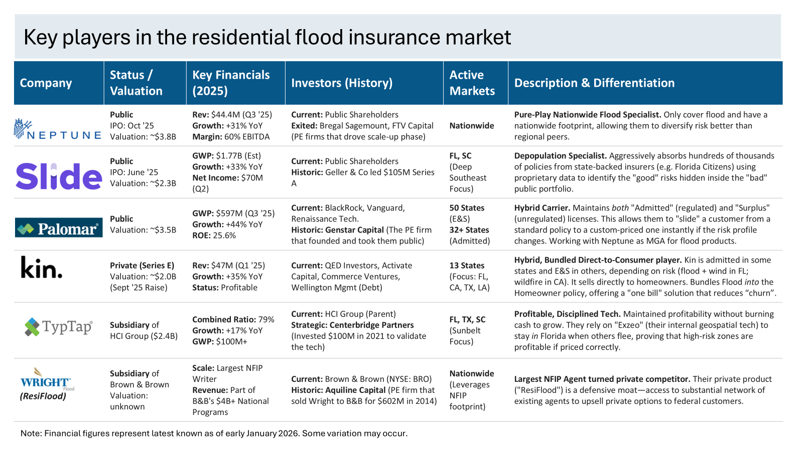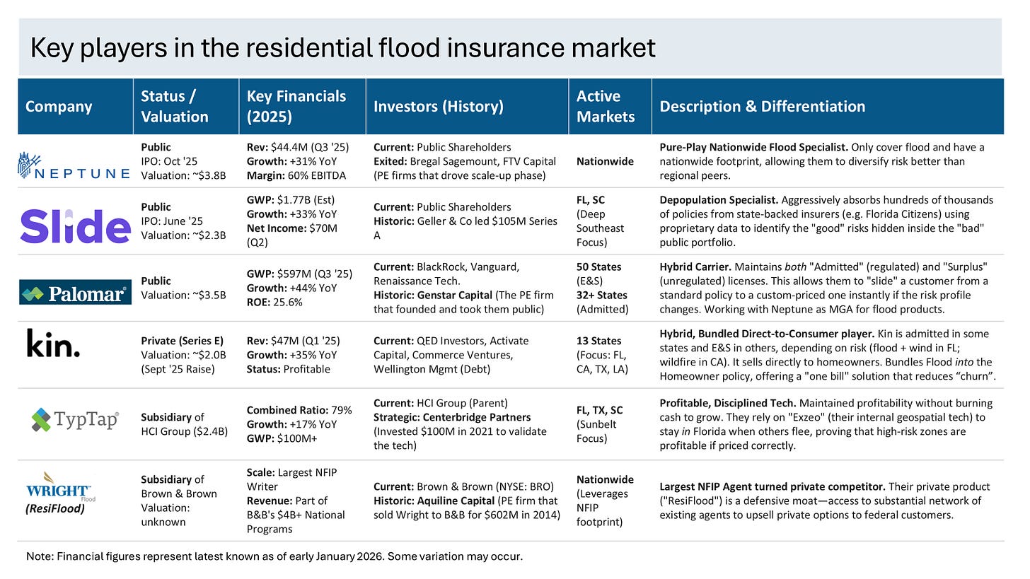 The combined valuation of today’s top players currently exceeds the entire private flood sector’s revenue. Investors are presently paying a “growth premium,” pricing these pioneers based on the projected $20B+ maturity rather than today’s $4B market size. Also, most players are already diversified beyond flood insurance: Palomar anchors on earthquake risk, while Kin bundles flood directly into broader homeowners policies. For diversifying players, the true addressable market extends well beyond the $20B flood-specific TAM estimate.